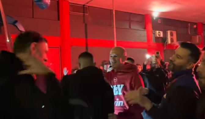 Ο πρόεδρος της ΚΑΕ έσπευσε να συγχαρεί προσωπικά όλα τα μέλη της ομάδας κατά την έξοδό τους από το πούλμαν, τη στιγμή που οι φίλοι του Ολυμπιακού τραγουδούσαν συνθήματα και άναβαν καπνογόνα.