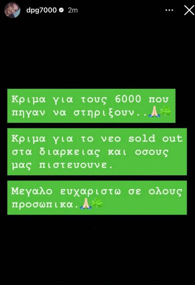 «Κρίμα για τους 6.000 που πήγαν να στηρίξουν. Κρίμα για το νέο sold-out στα διαρκείας και όσους μας πιστεύουν. Μεγάλο ευχαριστώ σε όλους», ανέφερε σε story του.