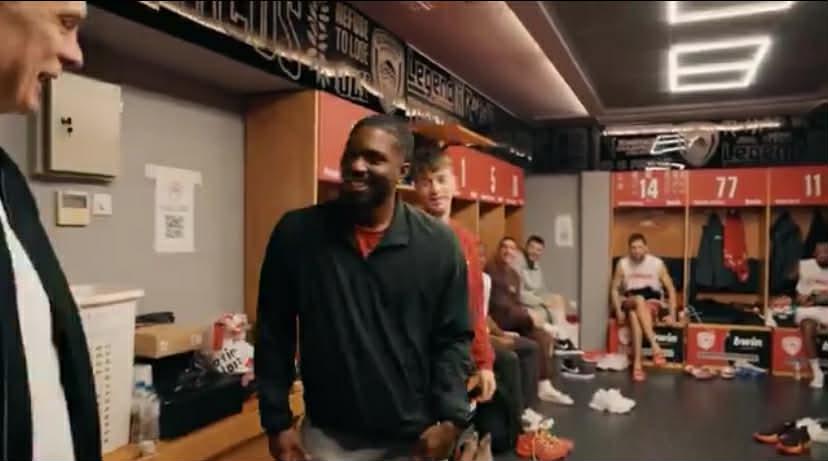 Δείτε τη στιγμή της έκπληξης, με τις ευχάριστες αντιδράσεις των παικτών του Ολυμπιακού αλλά και του Γιώργου Μπαρτζώκα, που έσπευσε να αγκαλιάσει τον Έβανς: