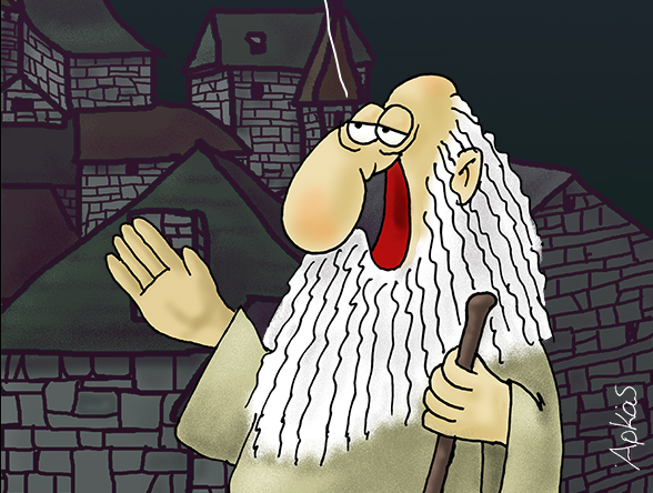 Σε αυτό το σκίτσο, ένας ηλικιωμένος με ειρωνικά σχόλια απευθύνεται στο κοινό, λέγοντας: «Σας υπόσχονται ότι θα καταργήσουν το ρουσφέτι και τους ψηφίζετε… γιατί είστε σίγουροι ότι δεν θα το κάνουν!».