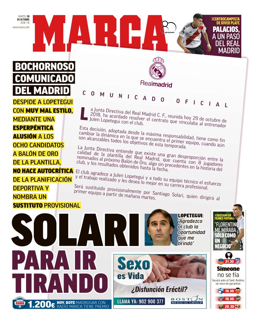 Η επίσημη ανακοίνωση της Ρεάλ Μαδρίτης αναφορικά με την απόλυση του Χουλέν Λοπετέγκι προκάλεσε την «έκρηξη» της MARCA η οποία ασκεί έμμεσα αυστηρή κριτική στον πρόεδρο του συλλόγου Φλορεντίνο Πέρεθ, επειδή δεν είχε σωστή