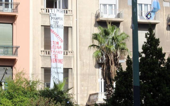 Τα μέλη του Ρουβίκωνα διαμαρτύρονται για το θάνατο ενός αναρχικού στην Αργεντινή.