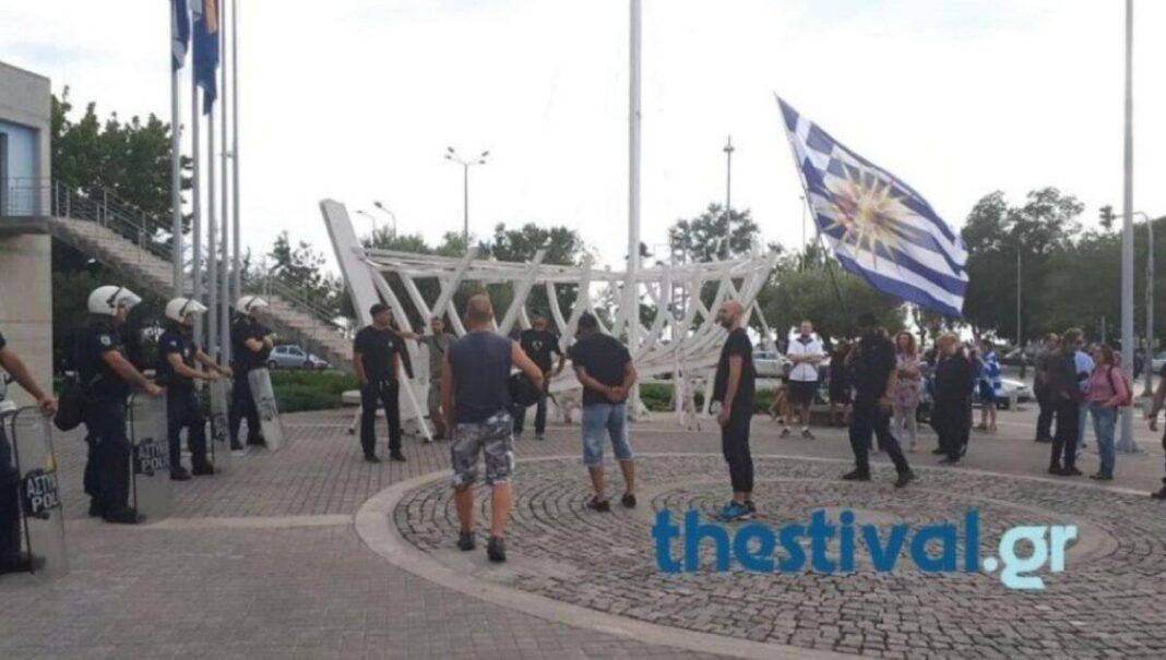 Περίπου 30 άτομα πραγματοποίησαν διαμαρτυρία για τη συμφωνία των Πρεσπών, με αφορμή εκδήλωση της εφημερίδας «Εποχή», όπου κεντρική ομιλήτρια ήταν η υπουργός Εργασίας, Εφη Αχτσιόγλου, που έφτασε στο δημαρχείο περίπου στις 6.30 μ.μ.