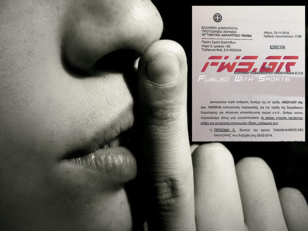 «Πάγωσε» η ποδοσφαιρική πιάτσα με την «σούπερ ντούπερ» αποκάλυψη του FWS.GR ότι για το παιχνίδι Παναθηναϊκός – Καλλονή το Μάρτιο του 2014, η εισαγγελία είχε παραγγείλει έρευνα για αδικήματα δωροδοκίας και δωροληψίας, καθώς και αλλοίωσης αποτελέσματος και, μάλιστα, είχε κληθεί να καταθέσει ο τότε διαιτητής και μέλος της ΚΕΔ σήμερα, Σταύρος Τριτσώνης. Το ρεπορτάζ του fws.gr που στηρίχθηκε σε έγγραφο – ντοκουμέντο του Πρωτοδικείου Αθηνών και συγκεκριμένα, του 13ου ανακριτικού τμήματος, που καλούσε τον Σταύρο Τριτσώνη να καταθέσει δυο χρόνια αργότερα, στις 3 Νοεμβρίου 2016.