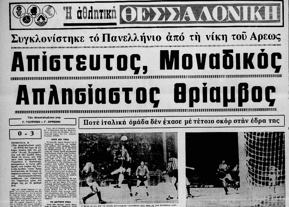 Ο ποδοσφαιρικός Άρης δεν έχει να επιδείξει τίτλους μετά το 1970, έχει χαρίσει όμως κορυφαίες ευρωπαϊκές στιγμές σε όλους τους Έλληνες φιλάθλους. Κορυφαία όλων παραμένει αναμφίβολα αυτή της 7ης Νοεμβρίου 1979, όταν πήγε στην Ιταλία και συνέτριψε με 3-0 την Περούτζια του Πάολο Ρόσι, παίρνοντας την πρόκριση για τους 16 του Κυπέλλου ΟΥΕΦΑ!