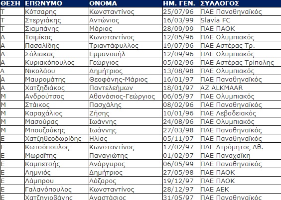 Την αποστολή για τα παιχνίδια με την Αυστρία, στις 16 και 20 Νοεμβρίου, για μία θέση στην τελική φάση του Ευρωπαϊκού Πρωταθλήματος Ελπίσων.