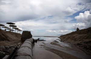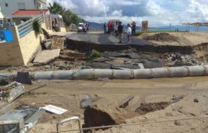 Στον παραλιακό δρόμο προς τα Νέα Βρασνά, ένα κομμάτι του οδοστρώματος υποχώρησε και αποκάλυψε την πλαστική σωλήνα του έργου του βιολογικού καθαρισμού, που τώρα κατασκευάζεται. Ο εκσκαφέας του Δήμου απελευθερώνει τη σωλήνα και ρίχνει άμμο για να αποκαταστήσει τη συγκοινωνία.