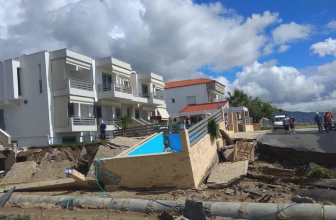 Ξηλωμένα κομμάτια από άσφαλτο σχηματίζουν «λοφάκια» ανάμεσα σε σπίτια. Τα νερά μπήκαν σε υπόγεια, αλλά και ισόγεια σπιτιών, ενοικιαζόμενων δωματίων και ξενοδοχειακών επιχειρήσεων, ενώ οι πισίνες τους γέμισαν με φερτά υλικά, χώμα και ξύλα που κατέβασαν οι χείμαρροι από το βουνό.