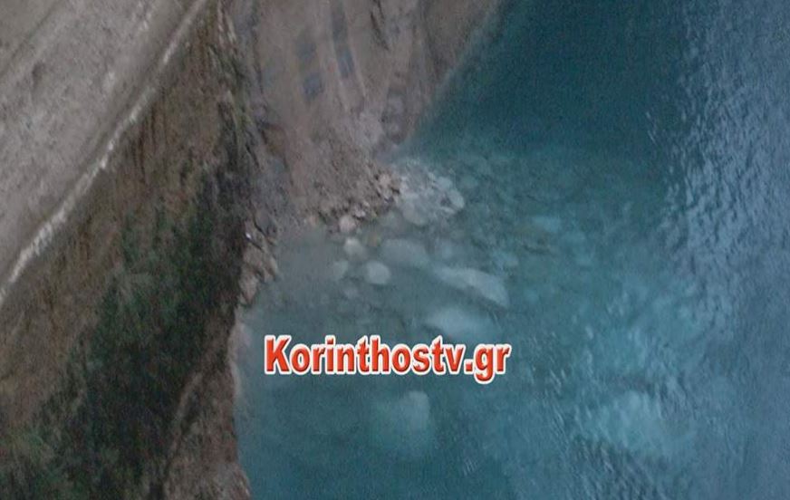 Τα πρανή υποχώρησαν, όπως διακρίνεται στις φωτογραφίες από το Korinthostv, με αποτέλεσμα να πέσουν κομμάτια από τα βράχια και χώματα μέσα στον Ισθμό.