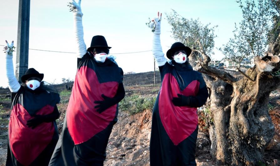 Σε σημείο από το οποίο πέρασαν οι μετέχοντες στον 36ο Μαραθώνιο Αθήνας, έβαλαν πανό, φορούν μαύρα ρούχα, με μία μεγάλη κόκκινη καρδιά, μάσκες και κλαδί ελιάς.
