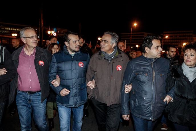 Στο μπλοκ του ΣΥΡΙΖΑ διαδήλωσαν στελέχη της κυβέρνησης και βουλευτές του κόμματος- ανάμεσά τους οι Νίκος Παππάς, Πάνος Σκουρλέτης, Παναγιώτης Ρήγας, Αννέτα Καββαδία, Νίκος Φίλης.