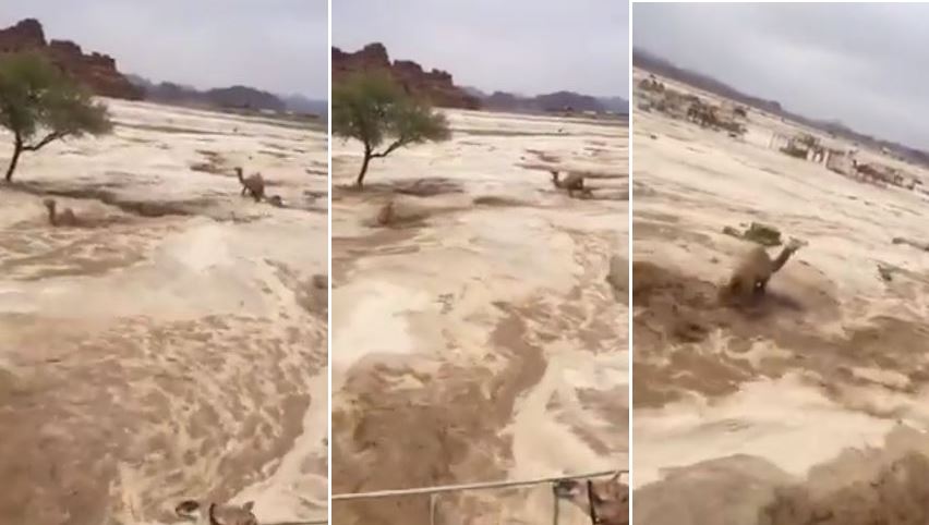 Σήμερα όμως τα βίντεο που κυκλοφόρησαν είναι ακόμα πιο συγκλονιστικά. Σ’ αυτά φαίνεται η έρημος να έχει μετατραπεί σε έναν χείμαρρο με απίστευτη ορμή που στο πέρασμά του παρασύρει τις καμήλες.