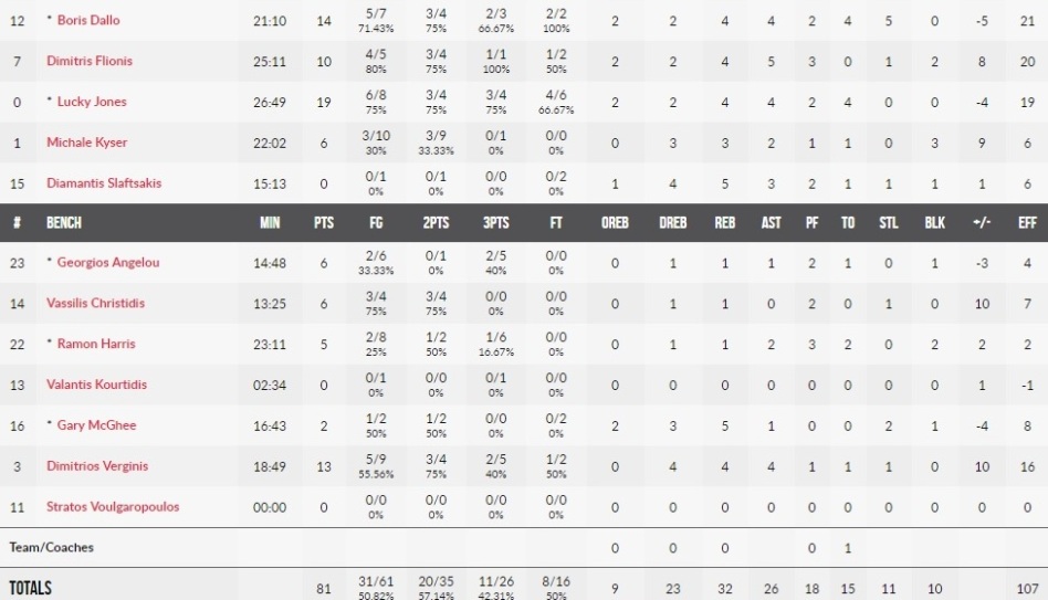 Κορυφαίος για τους νικητές ήταν ο Λάκι Τζόουνς, ο οποίος τελείωσε τον αγώνα με 19 πόντους, 4 ριμπάουντ και ισάριθμες ασίστ, ενώ άλλοι τρεις παίκτες (Νταλό, Βεργίνης και Φλιώνης) είχαν διψήφιο αριθμό πόντων. Από πλευράς ηττημένων, πρώτος σκόρερ ήταν ο Ντέγιαν Ιβάνοφ, ο οποίος είχε 19 πόντους, αλλά και 10 ριμπάουντ.