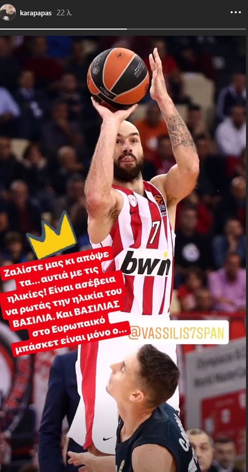 Συγκεκριμένα, ο Διευθυντής Επικοινωνίας της ερυθρόλευκης ΠΑΕ ανήρτησε τη σχετική φωτογραφία σε insta story γράφοντας: «Ζαλίστε μας και απόψε τα… αυτιά με τις ηλικίες. Είναι ασέβεια να ρωτάς την ηλικία του ΒΑΣΙΛΙΑ. ΚΑΙ ΒΑΣΙΛΙΑΣ στο Ευρωπαϊκό μπάσκετ είναι μόνο ο Βασίλης Σπανούλης».