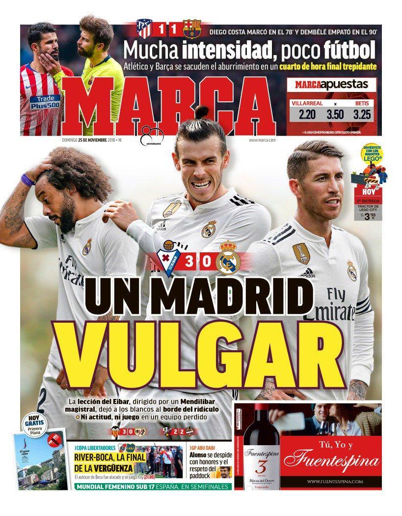 MARCA: «Μία άνοστη Ρεάλ. Το μάθημα της Έιμπαρ χάρις στο μαεστρικό κοουτσάρισμα του Μεντιλίμπαρ, οδήγησε τους “γκαλάκτικος” στο όριο της ντροπής. Μία χαμένη ομάδα χωρίς σωστή νοοτροπία και τρόπο παιχνιδιού».
