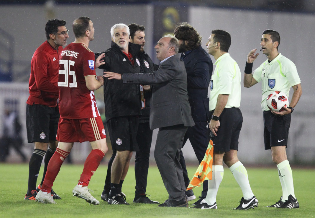Οι άνθρωποι του Ολυμπιακού διαμαρτύρονται έντονα για την μη καταλογισμό έμμεσου φάουλ στο 43’ σε γύρισμα του Σάκιτς στον Μέγιερι.