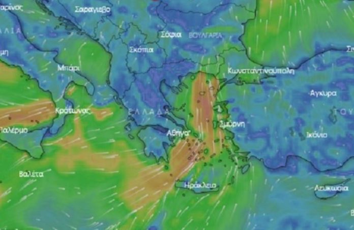 Άνεμοι: νότιοι νοτιοδυτικοί 5 με 7 και πρόσκαιρα στις Κυκλάδες τοπικά 8 μποφόρ, στρεφόμενοι από το απόγευμα σε δυτικούς νοτιοδυτικούς με εξασθένηση το βράδυ.