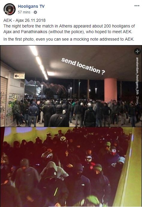 «Μια μέρα πριν την αναμέτρηση ΑΕΚ-Άγιαξ στην Αθήνα εμφανίστηκαν 200 χούλιγκανς των Ολλανδών και του Παναθηναϊκού, οι οποίοι τους οδήγησαν να συναντηθούν με αυτούς της ΑΕΚ», αναφέρει η σελίδα στο facebook Hooligans TV, επιβεβαιώνοντας το περιστατικό πως πρόκειται για οπαδούς των τριών προαναφερθέντων ομάδων.