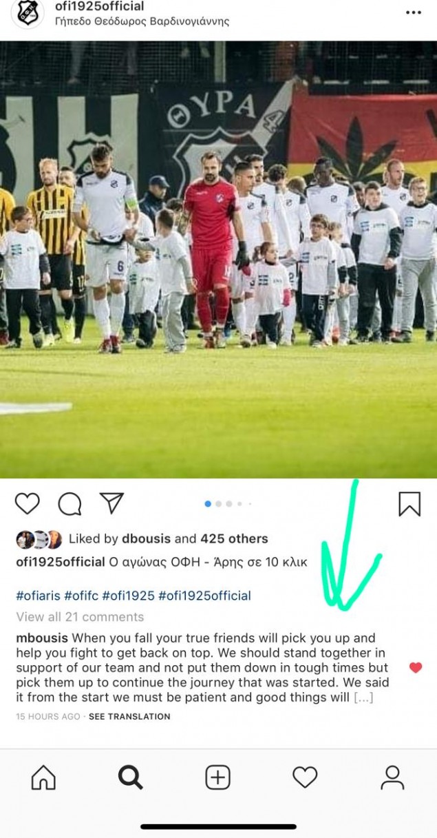 Συγκεκριμένα σε σχόλιο που έκανε κάτω από την ανάρτηση της ομάδας στο Instagram ανέφερε τα εξής: «Όταν πέσεις, οι αληθινοί σου φίλοι θα σε σηκώσουν και θα σε βοηθήσουν να επιστρέψεις όρθιος. Πρέπει να σταθούμε μαζί, για να υποστηρίξουμε την ομάδα μας και όχι να την ταπεινώνουμε στις δύσκολες στιγμές, αλλά να τη βοηθήσουμε να σηκωθεί και να συνεχίσει το ταξίδι που αρχίσαμε. Είπαμε από την αρχή πως πρέπει να είμαστε υπομονετικοί και θα έρθουν καλά πράγματα. Εμπιστευτείτε τη διαδικασία».