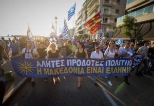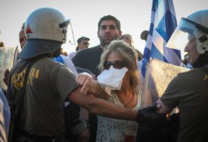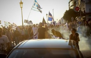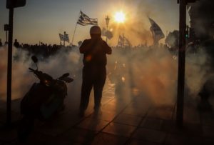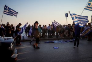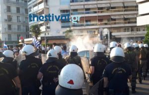 Eπεισόδια σημειώθηκαν αργά το απόγευμα, στην πορεία για τη Μακεδονία, στη Θεσσαλονίκη, όταν διαδηλωτές επιχείρησαν να προσπεράσουν καινούργιο μπλόκο που έστησε η αστυνομία στη συμβολή των οδών Στρατηγού Καλλάρη και Λεωφόρου Νίκης.