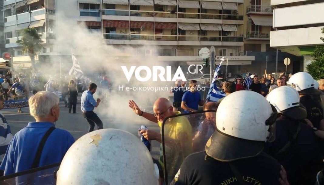 Eπεισόδια σημειώθηκαν αργά το απόγευμα, στην πορεία για τη Μακεδονία, στη Θεσσαλονίκη, όταν διαδηλωτές επιχείρησαν να προσπεράσουν καινούργιο μπλόκο που έστησε η αστυνομία στη συμβολή των οδών Στρατηγού Καλλάρη και Λεωφόρου Νίκης.