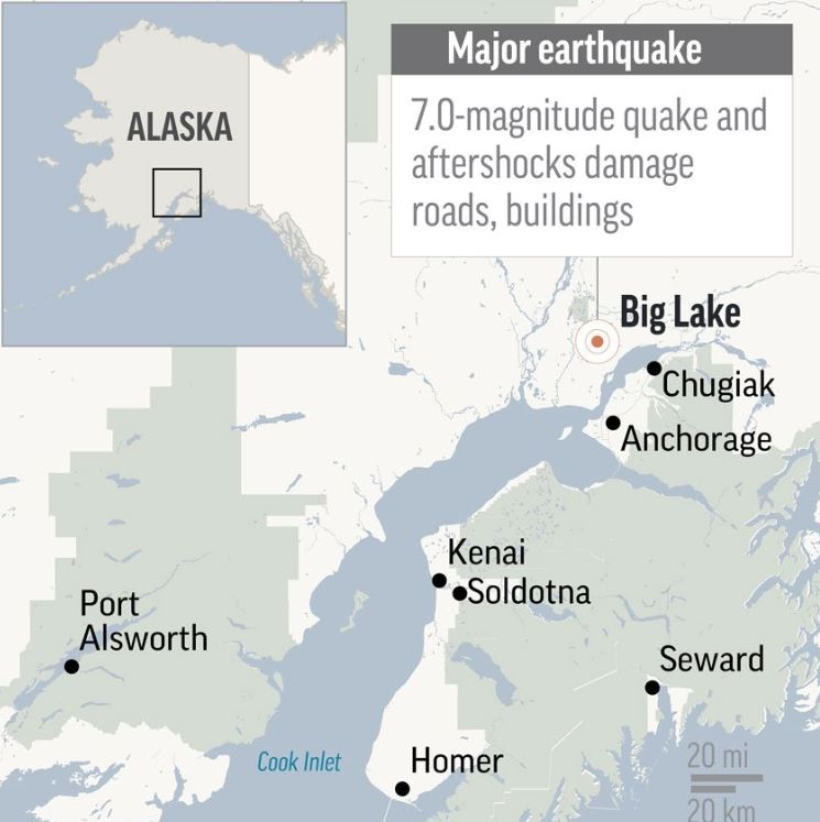 Αρχικά, το αμερικανικό γεωδυναμικό Ινστιτούτο είχε καταγράψει το μέγεθος του σεισμού στα 6,7 Ρίχτερ, ενώ στη συνέχεια προχώρησε σε αναθεώρηση σε 7 Ρίχτερ. Το επίκεντρο του σεισμού ήταν 12 χιλιόμετρα βόρεια της πόλης Ανκορατζ.
