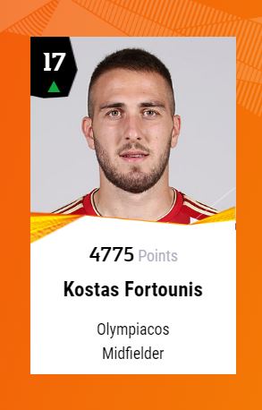 Συγκεκριμένα, ο Φορτούνης φιγουράρει στην 17η θέση στην σχετική λίστα (με 4.775 πόντους), σκαρφαλώνοντας πέντε θέσεις σε σχέση με το προηγούμενο παιχνίδι (ήταν 22ος), όπου είχε συμπεριληφθεί από την UEFA στην κορυφαία ενδεκάδα της 4ης αγωνιστικής του Γιουρόπα Λιγκ.