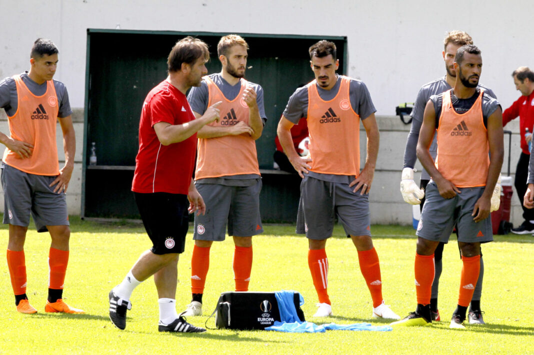 Μπορεί να μην έκανε δίτερμα, όμως στις ασκήσεις τακτικής έδειξε ότι θα βασιστεί στην διάταξη 4-2-3-1 και μάλιστα έφτιαξε δύο διαφορετικές 11άδες. Οι «κόκκινοι» είχε τον Γιαννιώτη κάτω από την εστία και η τετράδα της άμυνας αποτελούνταν από τους Μασούρα (δεξιά), Τσιμίκα (αριστερλα) και σέντερ μπακ τους Σισέ, Νικολάου. Ρομαό και Ανδρούτσος ήταν τα κεντρικά χαφ με την τριάδα μπροστά τους να αποτελείται από τους Πάρντο δεξιά, τον Χριστοδουλόπουλο αριστερά και τον Μάριν σε ρόλο επιτελικού. Ο Γκερέρο ήταν το σέντερ φορ,