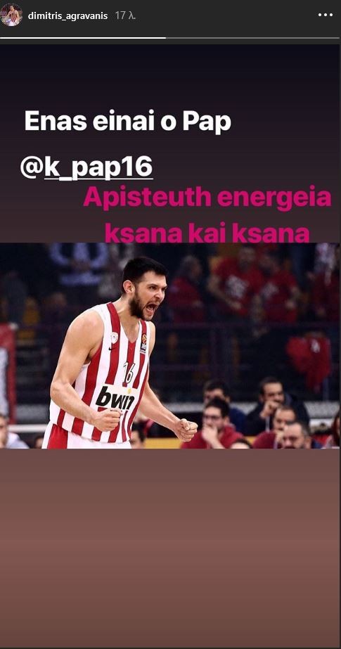 Ο Έλληνας φόργουορντ ανήρτησε ένα Insta story, στο οποίο είχε φωτογραφία του Παπανικολάου, με τον παίκτη να πανηγυρίζει παθιασμένα και το χαρακτηριστικό μήνυμα «Ένας είναι ο Παπ. Απίστευτη ενέργεια ξανά».