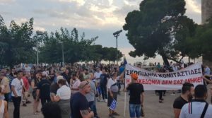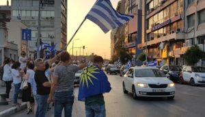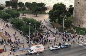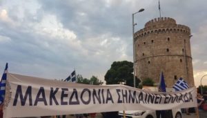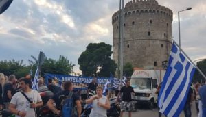 Στο μεταξύ στον Λευκό Πύργο, πλήθος κόσμου διαδηλώνει για το Μακεδονικό. Κρατώντας ελληνικές σημαίες και πανό υπέρ της ελληνικότητας της Μακεδονίας, απορρίπτουν τη συμφωνία των Πρεσπών, φωνάζοντας «Εδώ οι πατριώτες στο Hyatt οι προδότες» και «Ελλάς Ελλάς Μακεδονία».