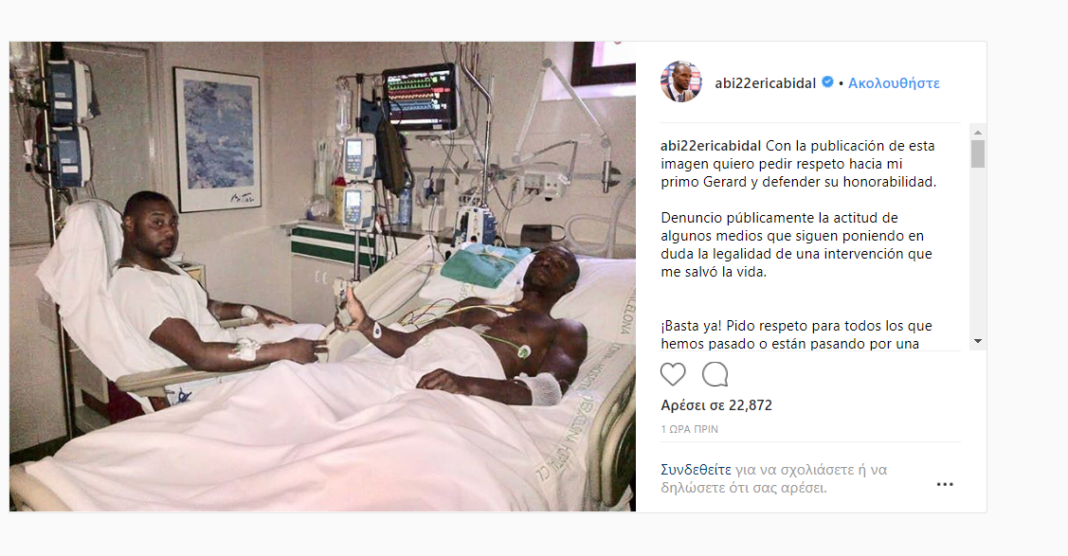 «Με αυτή τη φωτογραφία θέλω να ζητήσω σεβασμό για τον ξάδερφό μου Ζεράρ και να υπερασπιστώ την τιμή του. Καταγγέλλω δημόσια το επίπεδο διάφορων Μέσων που συνεχίζουν να θέτουν υπό αμφισβήτηση τη νομιμότητα μιας επέμβασης που μου έσωσε τη ζωή», έγραψε ο Αμπιντάλ δίπλα από την φωτογραφία