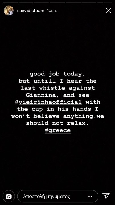 «Καλή δουλειά σήμερα αλλά μέχρι να ακούσω το τελευταίο σφύριγμα του διαιτητή στα Γιάννενα και να δω τον Βιεϊρίνια κρατάει το τρόπαιο του πρωταθλήματος, δεν θα πιστέψω τίποτα. Δεν θα πρέπει να χαλαρώσουμε», ανέφερε χαρακτηριστικά σε ανάρτηση του.