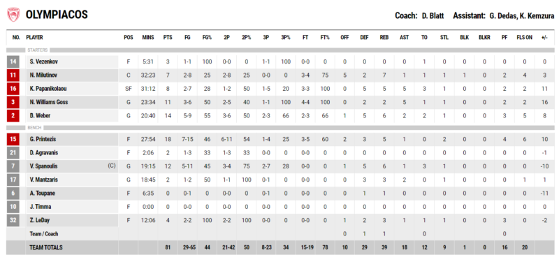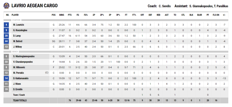 Κορυφαίος για τον Ολυμπιακό ήταν ο Γιώργος Πρίντεζης με 18 πόντους και 5 ριμπάουντ, ενώ για το Λαύριο ξεχώρισε ο Λαμπ με 16 πόντους και 3 ασίστ.