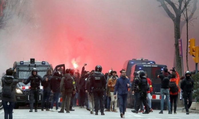 Οι οπαδοί της Λιόν ήταν σε μια πλατεία, όταν οι Καταλανοί τους επιτέθηκαν βίαια και πέντε Γάλλοι αναγκάστηκαν να μεταβούν τραυματίες σε τοπικά νοσοκομεία.