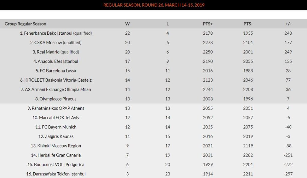 Οι δύο ελληνικές ομάδες ισοβαθμούν στην όγδοη θέση με 13 νίκες, με τον Ολυμπιακό να έχει το πλεονέκτημα σε περίπτωση ισοβαθμίας.