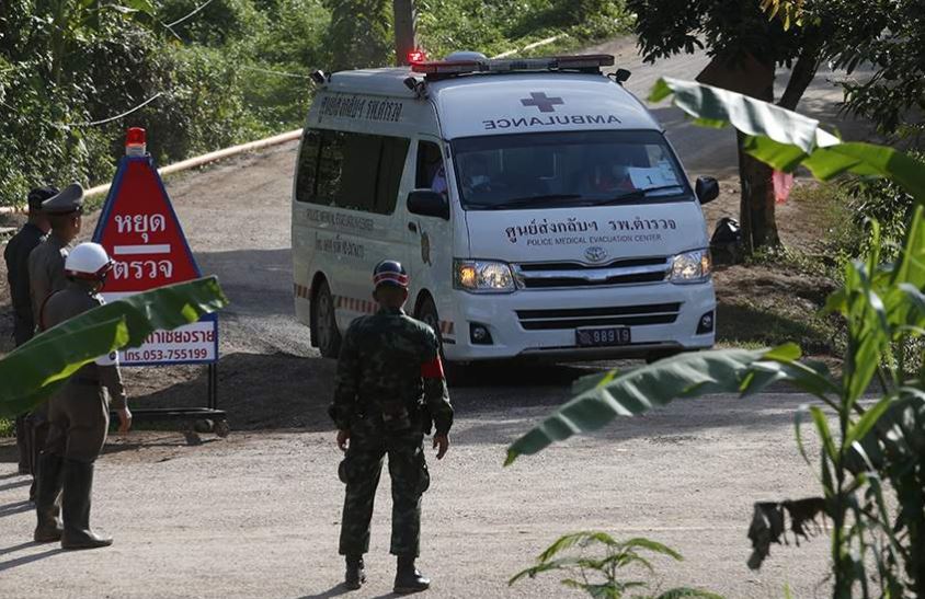 Οι τηλεοπτικοί σταθμοί της Ταϊλάνδης μετέδωσαν νωρίτερα βίντεο από ασθενοφόρο, που πιστεύεται ότι μετέφερε το πέμπτο αγόρι που διασώθηκε -και πρώτο σήμερα- προς το ελικόπτερο για τη μεταφορά του στο νοσοκομείο.