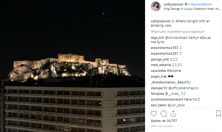 Στην Αθήνα βρίσκεται η Κέιτλιν Τζένερ, σύμφωνα με τον προσωπικό της λογαριασμό στο Instagram.