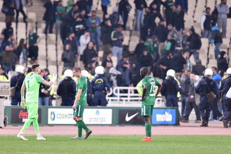 Ο δικηγόρος της πράσινης ΠΑΕ, Αλκης Παπαντωνίου είπε τα εξής: «Στο 59′ η ομάδα οπαδών βγήκε και συγκρούστηκε με την Αστυνομία, που έκανε περιορισμένη χρήση δακρυγόνων. Εμείς μεταφέραμε 3.000 κόσμο στη θύρα 29, χωρίς να συμβεί το παραμικρό. 15 άτομα πήγαν προς άλλη κατεύθυνση, τους συγκράτησαν εκτός αγωνιστικού χώρου, πίσω από τις πινακίδες. Ο διαιτητής διέκοψε το παιχνίδι στις 20:45, αποσύρθηκαν όσοι βρίσκονταν στο γήπεδο χωρίς να συμβεί το παραμικρό. Οι κερκίδες άδειασαν με πρωτοβουλία των ανθρώπων μας για να συνεχιστεί το παιχνίδι. Οι θύρες που έγιναν τα επεισόδια είχαν εκκενωθεί πλήρως και μετά είχαμε τις συσκέψεις. Ο διαιτητής ρώτησε την αστυνομία εάν μπορεί να εγγυηθεί την ασφαλή διεξαγωγή του αγώνα και αυτή απάντησε ότι μπορεί ανεπιφύλακτα. Ακούμε από την τηλεοπτική μετάδοση ότι όλα έχουν καθαρίσει, οι κερκίδες, η ατμόσφαιρα, ότι έχει αποκατασταθεί η ομαλότητα. Είναι 33 λεπτά μετά τη διακοπή, 21:18. Παραθέτουμε το πότε βγήκε και μπήκε ο διαιτητής».