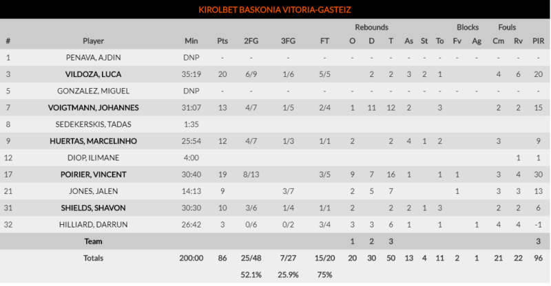 Με τους Βιλντόζα και Πουαριέ να κάνουν εξαιρετικό παιχνίδι στο επιθετικό κομμάτι, οι Βάσκοι κατάφεραν να προηγηθούν στο ημίχρονο με 39-36.