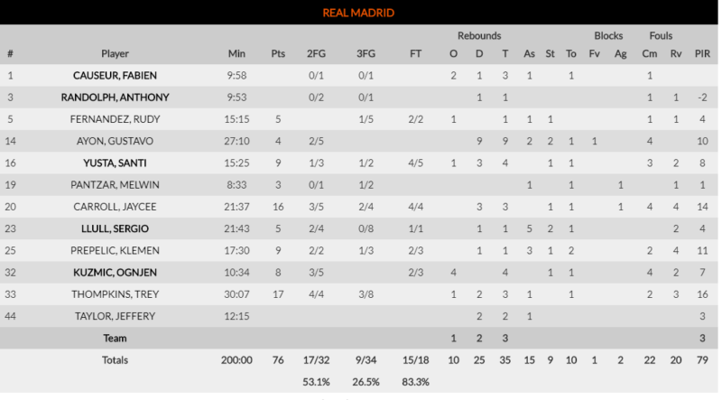 Η Ρεάλ Μαδρίτης των πολλών απουσιών ήταν αρκετά άστοχη έξω από τα 6.75 και έχασε κατά κράτος την μάχη των ριμπάουντ (47-32), με την τρίτη περίοδο να γέρνει τελειωτικά την πλάστιγγα υπέρ των γηπεδούχων με σερί 25-17.