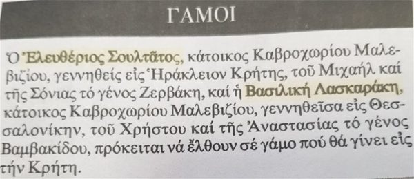 «Ο Ελευθέριος Σουλτάτος, κάτοικος Καβροχωρίου Μαλεβιζίου, γεννηθείς εις Ηράκλειον Κρήτης, του Μιχαήλ και της Σόνιας, το γένος Ζερβάκη και η Βασιλική Λασκαράκη, κάτοικος Καβροχωρίου Μαλεβιζίου, γεννηθείσα εις Θεσσαλονίκην, του Χρήστου και της Αναστασίας, το γένος Βαμβακίδου, πρόκειται να έλθουν σε γάμο που θα γίνει εις την Κρήτην».