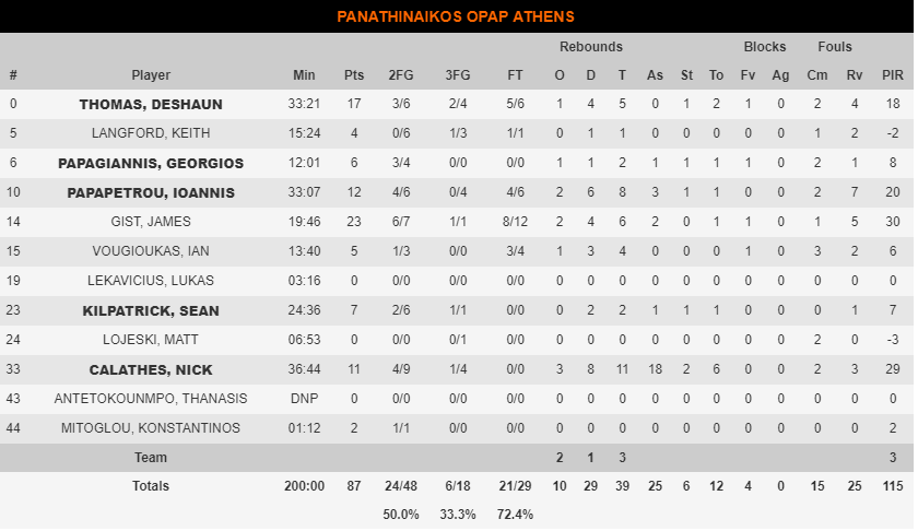 Ο Νικ Καλάθης ήταν απίστευτος στο ματς και κατάφερε να κάνει ένα απίστευτο triple double και κράταγε τα ηνία του σκορ για τον Παναθηναϊκό (73-63). Μέχρι το φινάλε του ματς δεν άλλαξε κάτι. Οι πράσινοι κράτησαν μέχρι το τέλος το προβάδισμα τους και πήραν τη νίκη (87-67) και την πρόκριση στα playoffs.