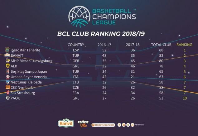 Στην κορυφή βρίσκεται η πρώτη κάτοχος του Champions League, Τενερίφη, η οποία μετρά 88 πόντους, ενώ την τριάδα συμπληρώνουν η Μπάνβιτ (83 μονάδες) και η Λούντβιγκσμπουργκ (80 μονάδες). Αξίζει να σημειωθεί ότι θέση στη λίστα δεν έχει η Μονακό, παρούσα και στα δύο final four της διοργάνωσης, καθώς από τη νέα σεζόν θα αγωνίζεται στο Eurocup.