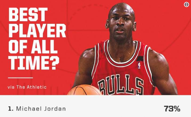Στη σχετική ψηφοφορία, στην οποία συμμετείχαν 117 παίκτες του κορυφαίο πρωταθλήματος, για λογαριασμό του «The Athletic», η επικράτηση του Τζόρνταν ήταν συντριπτική. Ο θρύλος του παγκόσμιου μπάσκετ συγκέντρωσε το 73% των ψήφων, αφήνοντας… χιλιόμετρα πίσω τους τους ΛεΜπρόν Τζέιμς και Κόμπι Μπράιαντ, που κατέλαβαν τη 2η και 3η θέση αντίστοιχα.