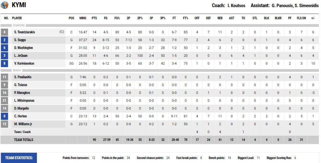 Οι γηπεδούχοι βρήκαν τις επιθετικές λύσεις και με τον εκπληκτικό Καρινιάουσκας (18 πόντοι) έφτασε και πάλι τη διαφορά στους εφτά πόντους (77-70). Μέχρι το φινάλε δεν άλλαξε κάτι και η Κύμη πανηγύρισε τη σπουδαία νίκη με 90-83.