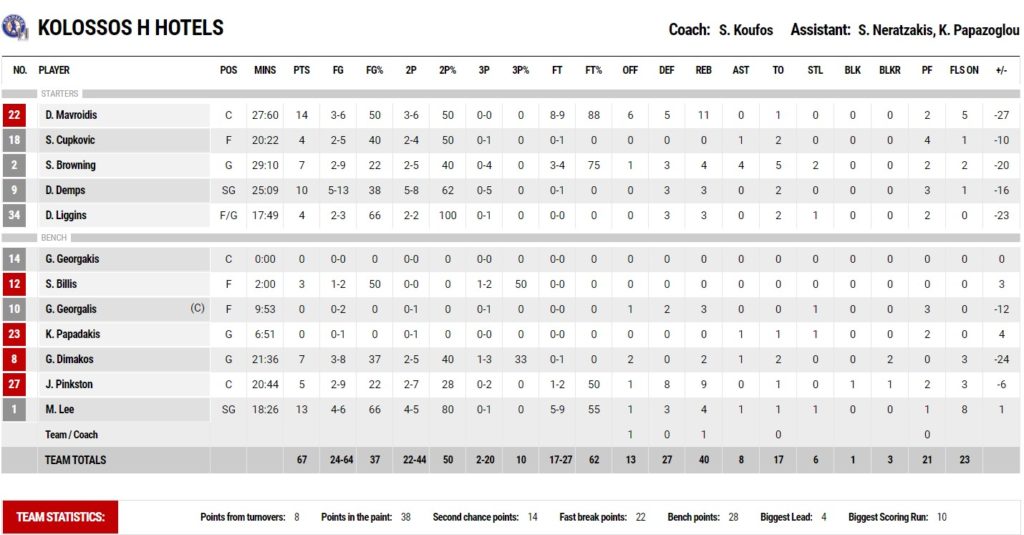 Κολοσσός (Κουφός): Μαυροειδής 14 (11 ριμπάουντ), Τσούπκοβιτς 4, Μπράουνινγκ 7 (2/9 σουτ, 4 ριμπάουντ, 4 ασίστ), Ντεμπς 10 (5/13 σουτ), Λίγκινς 4, Μπιλλής 3 (1), Γεωργαλής, Παπαδάκης, Δημάκος 7 (1), Πίνκστον 5 (2/9 σουτ, 9 ριμπάουντ), Λι 13