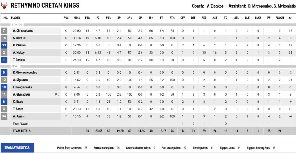 Ρέθυμνο (Ζιάγκος): Χριστοδούλου 13 (2), Μπαρτ 19 (4/6 τρίποντα), Κλάντον, Χίκι 14 (4/7 δίποντα, 2/6 τρίποντα, 10 ριμπάουντ, 16 ασίστ, 3 κλεψίματα), Ντάνιελς 16 (2), Οικονομόπουλος, Σιγκούνας 9 (1), Καλογιαννίδης, Γλυιαδάκης 5, Ραζής 2, Μπάντερ 11 (3), Τζόουνς 4