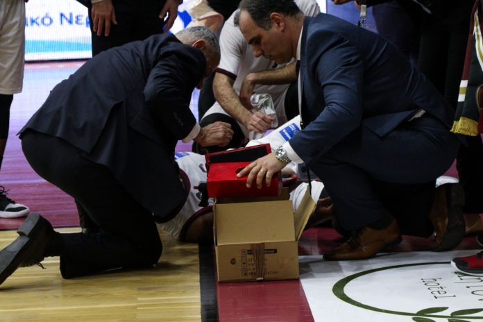 Τ’ αποτελέσματα έδειξαν ότι έχει υποστεί κάκωση οσφυϊκής μοίρας στην σπονδυλική στήλη (αριστερά). Ο Αμερικανός γκαρντ θ’ ακολουθήσει φαρμακευτική αγωγή, θα κάνει φυσικοθεραπείες και η κατάστασή του θα παρακολουθείται από το ιατρικό επιτελείο της ομάδας μας. Η οικογένεια του Ηφαίστου εύχεται στον αθλητή μας, ταχεία ανάρρωση».