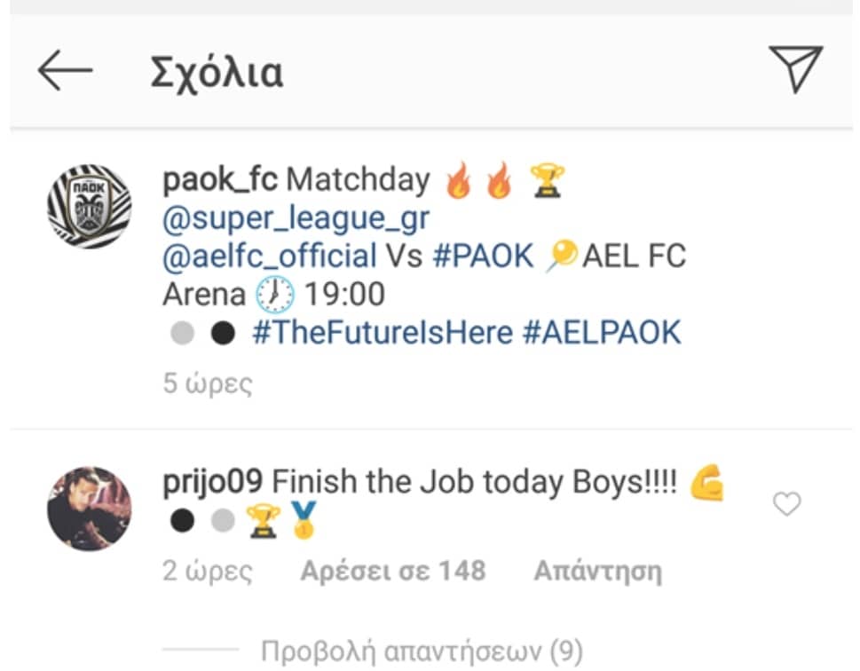 Σε σχετική φωτογραφία της ΚΑΕ ΠΑΟΚ ο Πρίγιοβιτς έγραψε: «Τελειώστε την δουλειά από σήμερα παιδιά».