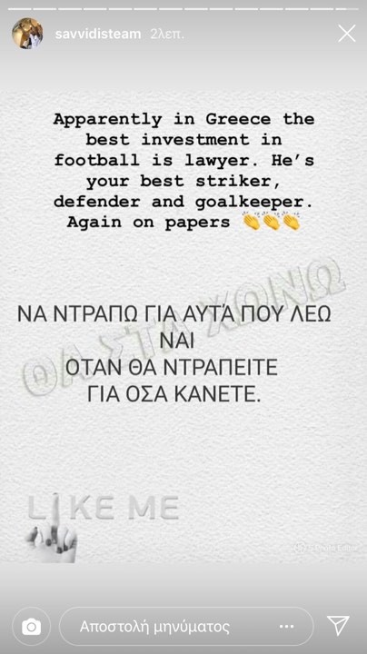 «Προφανώς στην Ελλάδα η καλύτερη επένδυση στο ποδόσφαιρο είναι οι δικηγόροι. Είναι ο καλύτερος επιθετικός, αμυντικός και τερματοφύλακας σας. Ξανά στα χαρτιά. Να ντραπώ γι΄αυτά που λέω, ναι. Όταν θα ντραπείτε για όσα κάνετε».
